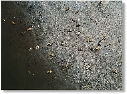 一の宮川の潮が引くと、干潟に沢山のカニが現れ、思い思いに甲良干し。ではなくって本当は何か意味があって、こうしているのでしょう。写真は一宮館前で。これは